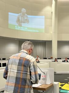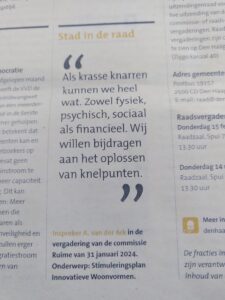De radertjes grijpen langzaam in elkaar. We horen dat GroenLinks met CDA en D66 een motie onder de titel ‘Realiseer Knarrenhof’ voorbereiden ter aanvulling van het Stimuleringsplan als dat in een raadsvergadering besproken en vastgesteld zal gaan worden. Op 11 maart 2024 mogen we samen met Peter Prak aan de wethouder van Ruimtelijke Ordening ons concept uit leggen, wat er in de loop van de tijd allemaal is ondernomen onder de vlag van Knarrenhof in Den Haag en welk woud aan regels en beleid het niet bevordert dat er iets van de grond komt. Peter maakt ook duidelijk dat